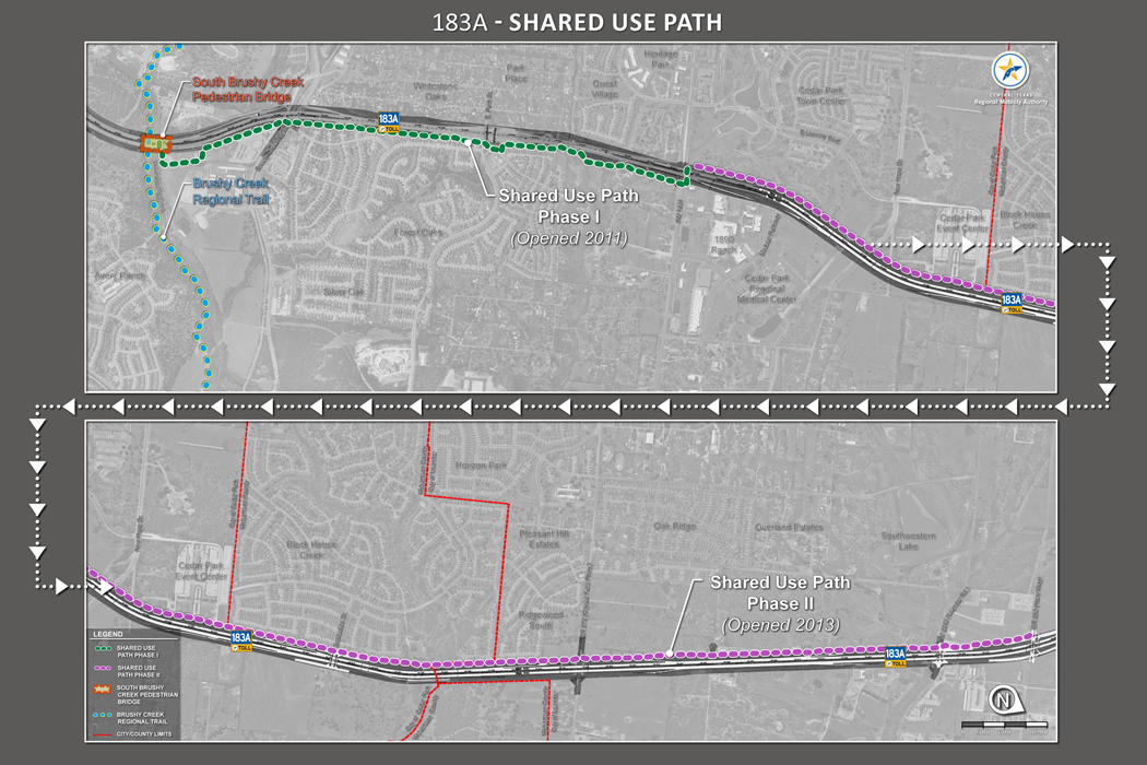 Central Texas Regional Mobility Authority (CTRMA) has announced the opening of the 183A Shared Use Path. Walkers, joggers and cyclists can now get from Leander to Cedar Park and points beyond thanks to the opening of the second phase of the 183A Shared Use Path. The $3.1 million, five mile project extends along the west side of 183A from RM 1431 north to Hero Way and connects with phase one, a 2.3-mile section that opened in 2011 and runs from South Brushy Creek to RM 1431. The 10-foot wide concrete shared-use path was built by CTRMA, which runs the 183A toll road.