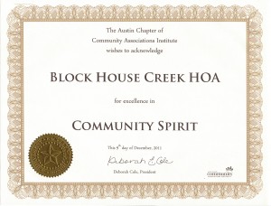 Your Board of Directors is extremely proud to announce that on the evening of December 9, 2011, Block House Creek Owners Association was recognized by the Community Association’s Institute (CAI), Austin Chapter, during its’ first Community Awards Gala, for Excellence in Community Spirit!