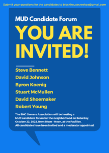 BHC MUD Candidate Forum, Saturday October 22, 10 a.m. to Noon